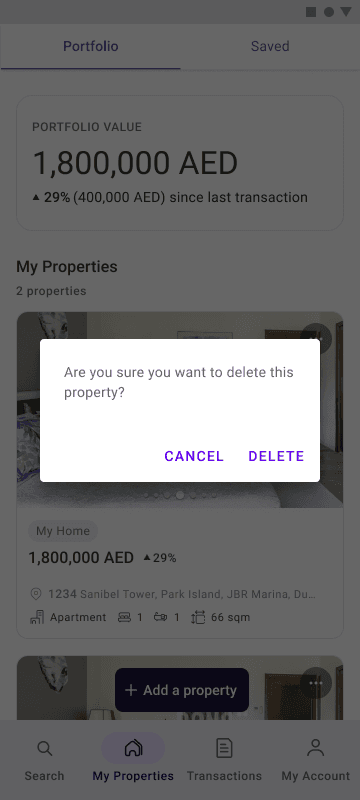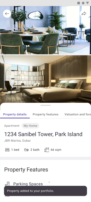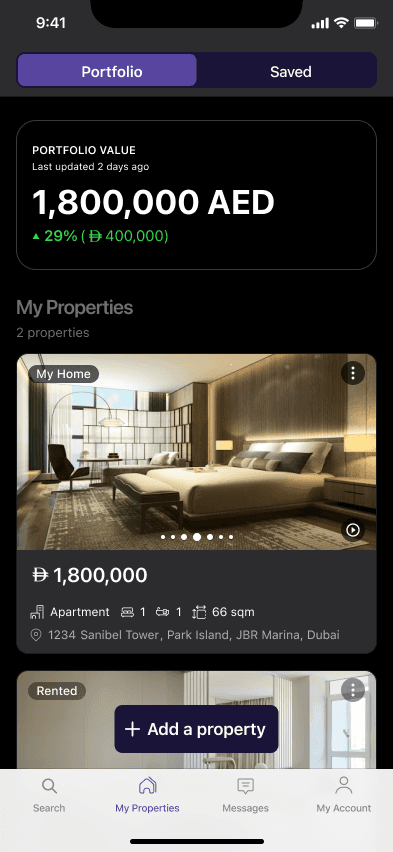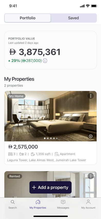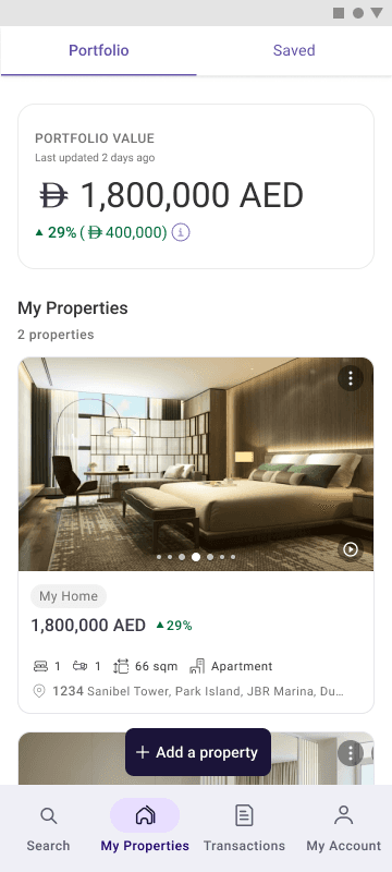 I designed a hub to keep our consumers engaged after they buy or rent a property on our platform. Research showed engagement dropped sharply once a listing closed, so I focused the MVP on what owners value most: real-time property valuations and simple portfolio tracking.